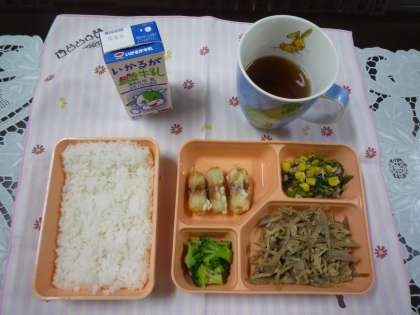 【本日のメニュー】鶏ごぼうご飯、ちくわのてんぷら、ツナと野菜の炒めもの、ブロッコリーのしょうがづけ、米飯、牛乳でした。鶏ごぼうご飯の完成図は、写真2枚目で。
