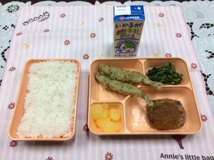 【本日のメニュー】おろしハンバーグ、ししゃもの磯辺フリッター、水菜のおひたし、りんご缶詰、米飯、牛乳でした。