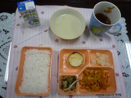 【本日のメニュー】鶏肉と野菜のカレーソテー、カップグラタン、だいこんのドレッシングあえ、チンゲンサイとしめじの炒めもの、ポタージュ、米飯、牛乳でした。