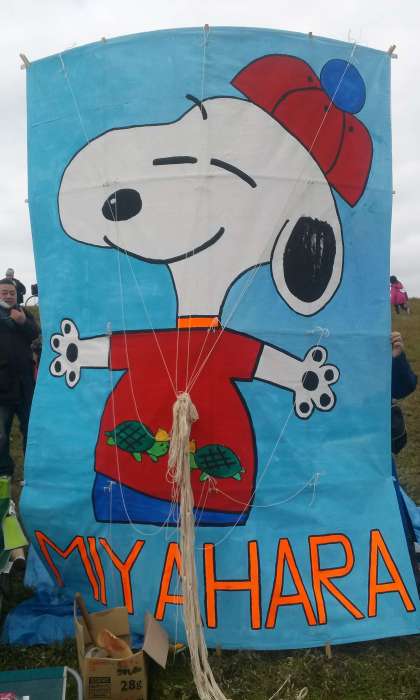 宮原校区の凧にはスヌーピーと宮原小学校のマスコットキャラクター、カメの「あゆむくん」と「みらいちゃん」が描かれました。