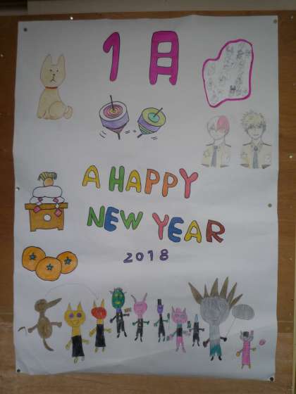 特別支援学級恒例の毎月の看板ができました。1月はやはり「Happy New Year」。今年の干支であるワンコもちゃんと描かれていますね。