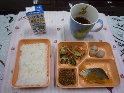 【本日のメニュー】さごしのおろしポン酢かけ、豚肉と野菜の炒めもの、さといもの煮もの、おかか菜っ葉、米飯、牛乳でした。