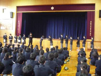 今日の2年生の学年集会では、先日(1/31)に行われた百人一首大会の結果発表と表彰が行われました。