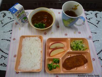 【本日のメニュー】ビーフシチュー・ブロッコリー、サーモンチーズフライ、きゅうりのサラダ、りんご、米飯、牛乳でした。
