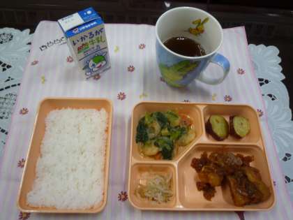 【本日のメニュー】油淋鶏、えびとチンゲンサイの炒めもの、焼きさつまいも、もやしのピリ辛あえ、米飯、牛乳でした。