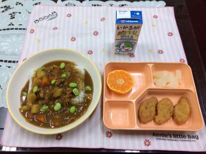 ポークカレーライス・枝豆、チキンナゲット、だいこんのピクルス、みかん、米飯、牛乳でした。