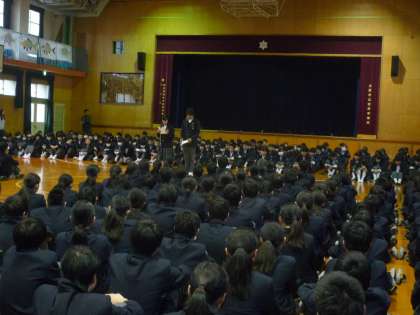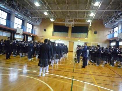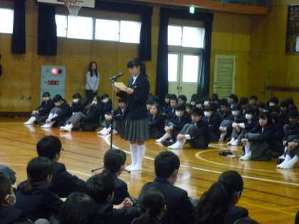 本日の1限目、全校集会に続き、体育館で「3年生を送る会」を行いました。3年生の各学級代表が自分のクラスについて語った後、在校生からの贈る言葉、3年生のお礼の言葉が述べられました。最後は1、2年生が作った花道を3年生が拍手で送られていきました。
