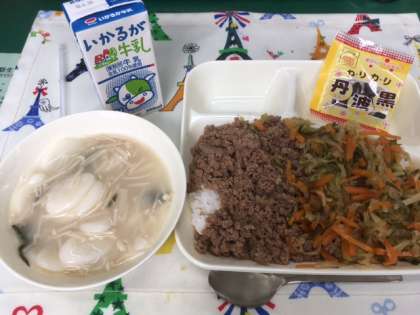 本日3日目になる給食は「ビビンバ、トック、黒いり豆、牛乳」でした。