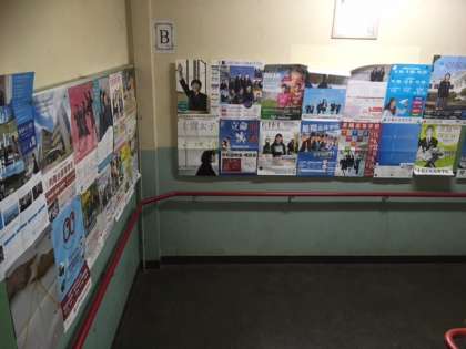 3年生校舎階段の踊り場には、たくさんのポスターが貼られています。