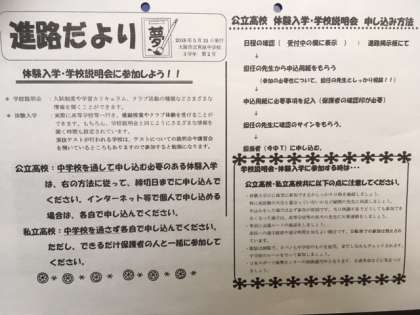 3年生は「進路だより」第2号をしっかり読んで、体験入学、説明会に積極的に参加しましょう。