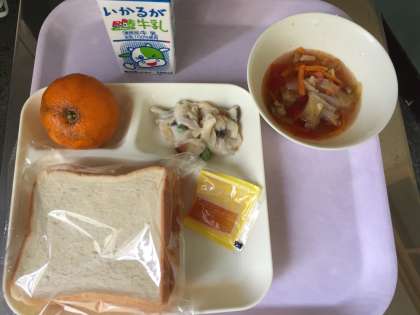 豆乳マカロニグラタン、トマトスープ、冷凍ミカン、食パン、牛乳