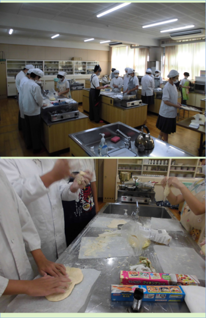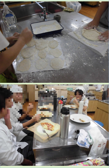 生活文化部の生徒が8時30分に調理室に集まりピザ作りをしました。各自が生地をこねてしばらく寝かせて発酵させ、好きな大きさのピザ生地にトッピングをしてオーブンで焼きました。