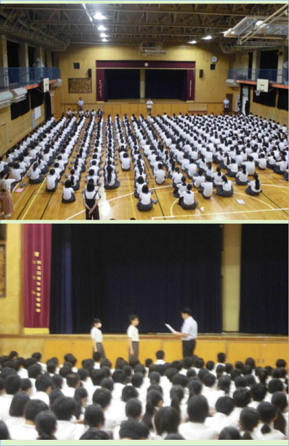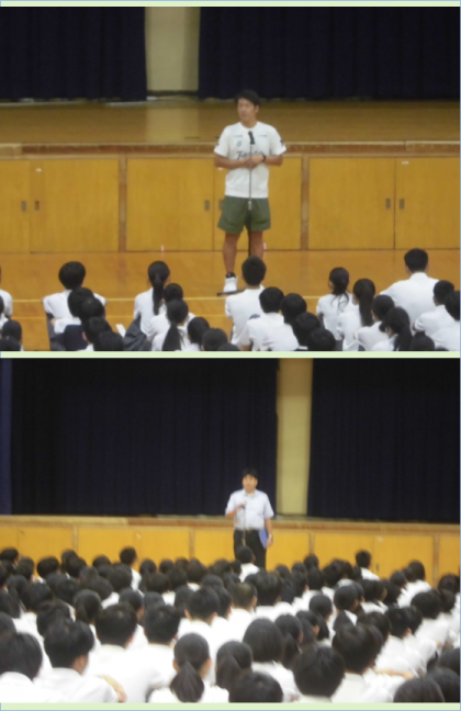生徒指導主事の先生からは、「あいさつ」と「名乗り出る勇気」についての話がありました。快適に学校生活を送るために、実践していきましょう!