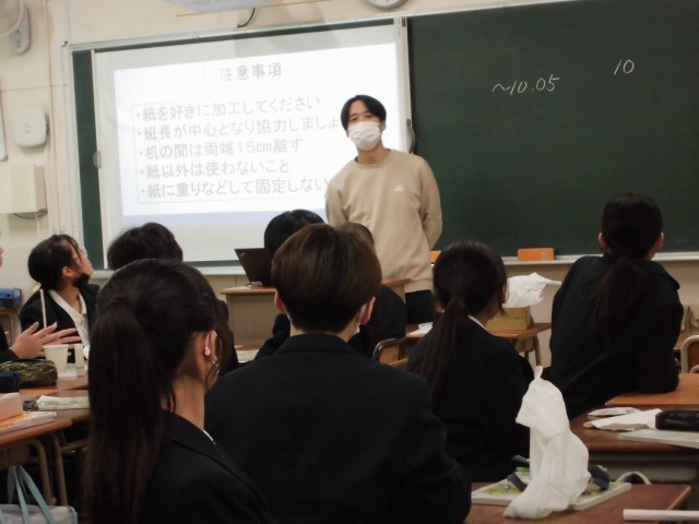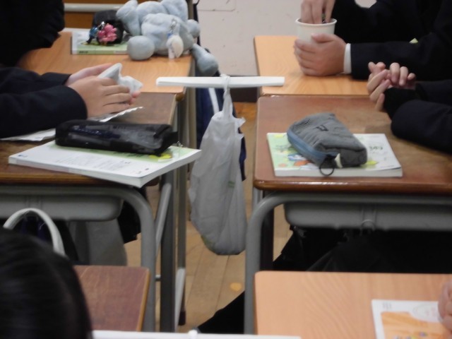 班ごとに話し合い、A4の紙を好きに折り曲げて、重さに耐えられるペーパーブリッジを考えました。ペーパーブリッジにビー玉を吊るして負荷をかけ、どの班が一番ビー玉を載せられるかを競い合いました。身近な製品は強度も考えられて作られていることを学習しました。