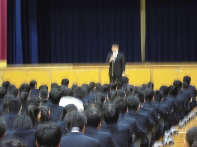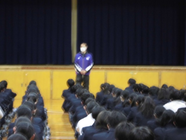 生徒指導主事の先生からは、登下校時の交通安全についての話がありました。「数名で道を広がって歩かない。歩道を歩く。横断歩道を渡る。止まっていただいたドライバーさんに対してはお礼の会釈をする等」の注意がありました。