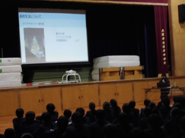 高2の卒業生に来校してもらい、高校のカリキュラム、高校生活、進路選択の方法や受験の心得等について、2年生対象に話をしていただきました。