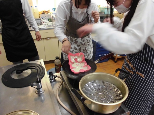 調理実習で蒸しパンを作りました。黒糖を加えた生地をよく混ぜ、型に流し入れます。フライパンに少量の水を張り、ふたをして約12分蒸すと、ふんわりとした甘みのある蒸しパンが完成しました。生徒たちは手軽さと仕上がりの良さに驚いていました。でき上がった蒸しパンは温かく、黒糖の香りが広がり、とても好評でした。家庭でも挑戦してみたいという声も聞かれました。
