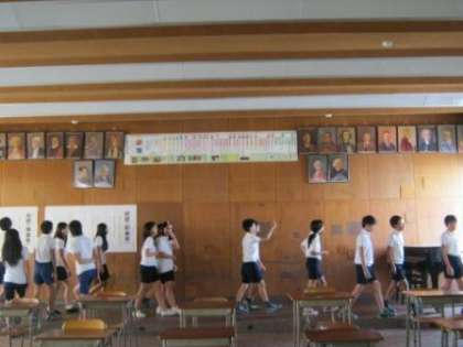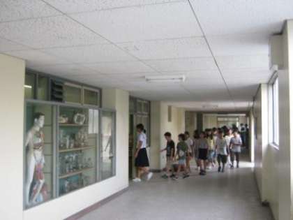 部活動をはじめとした中学校生活全般についてのビデオを上映した後、いよいよ校内の見学です。今回は、音楽室や理科室・木工室など、特別教室を中心に案内しました。小学6年生の皆さんも半年後には中学生。淡路中学校のよき伝統を受け継いで欲しいものです。