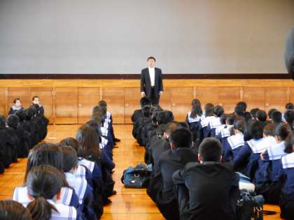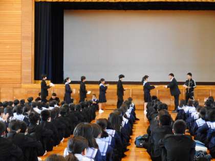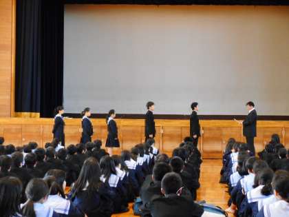 全校集会で、生徒会役員、常任委員の代表生徒に認症状を渡しました。委員の皆さん、頑張ってください。期待しています。