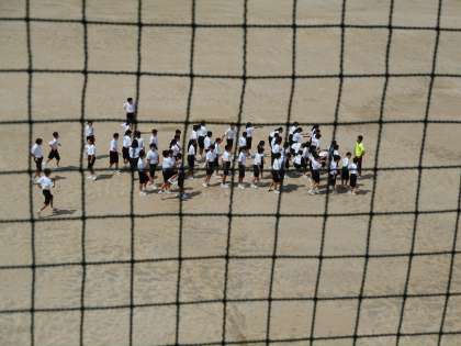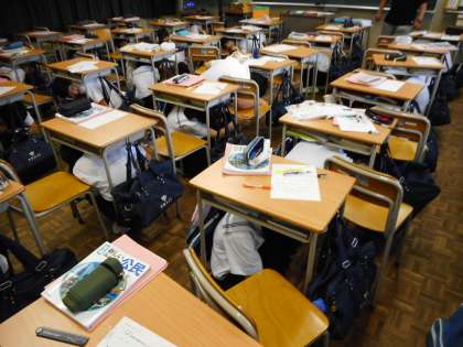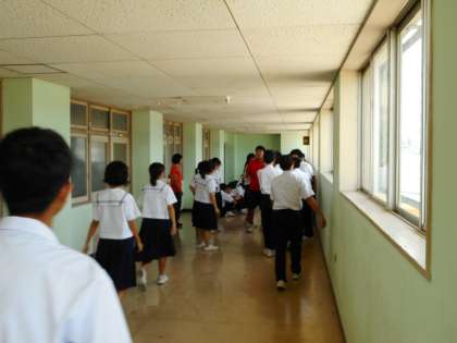 地震発生時には教室では机の下に、また体育館での授業ではグランドに集合し、大津波警報が発令されると4階に避難しました。