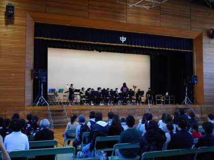 最初の舞台発表で、吹奏楽部が演奏を披露しました。3年生が引退し、1・2年生中心の発表は今回が初めてでした。緊張したようですが、部員の皆さんの熱演に、会場から大きな拍手をいただきました。