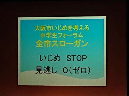 大阪市のすべての中学校の生徒会代表が一同に会し、いじめをなくす取り組みの交流を行いました。各ブロックのモデル校からの発表に続き、各ブロック代表校からブロックでの取り組みやブロックでのスローガンの発表がありました。