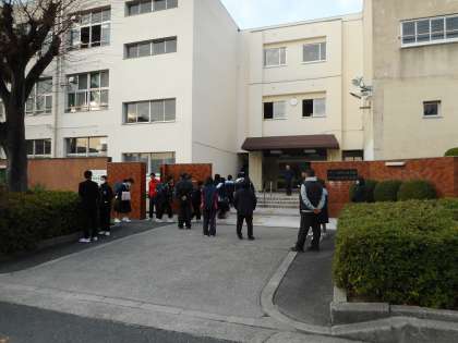 「遅刻0(ゼロ)」ののぼり旗をたてて、登校する生徒に「遅刻0(ゼロ)」を呼びかけました。