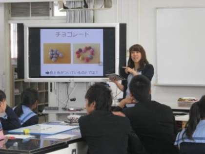今回の学習テーマは「いろいろな加工食品」。生徒たちは電子黒板に映し出されるヒントを手掛かりにして、「おいしい」と感じる要因(味覚や視覚、嗅覚など)を話し合っていました。CG画像を駆使した映像資料(教材)は生徒が容易に理解できる工夫がされれいました。これからも、わかる授業づくりに努めてまいりたいと思っています。