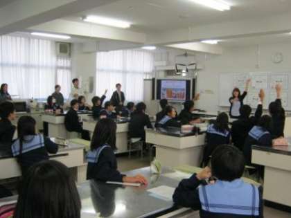 先日、淡路中学校で先生方の授業研究会を開催し、家庭科で電子黒板を活用した授業を行いました。
