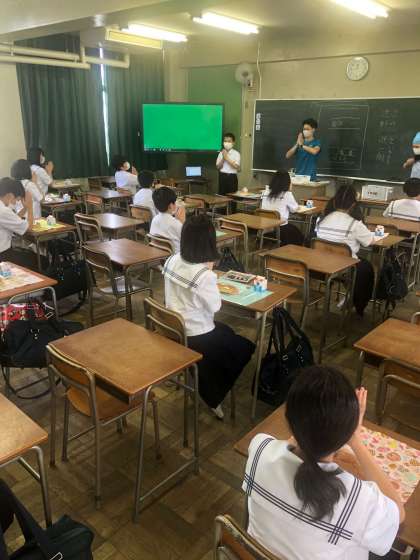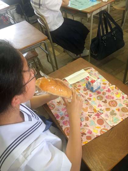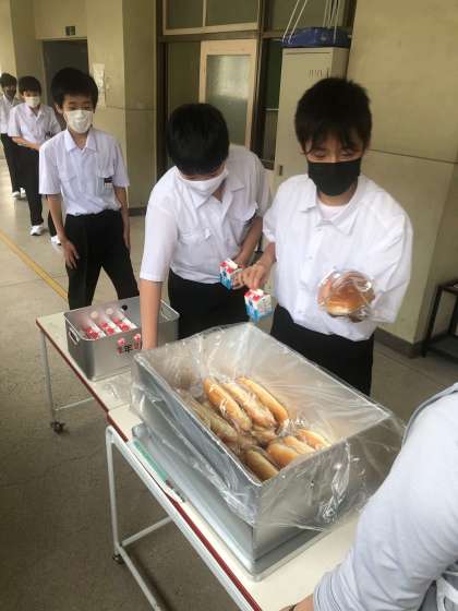 ホームルームが終わった後、手洗いを済まし、一人ひとりが個々に取りに行き、全員前を向いていただきまーす。