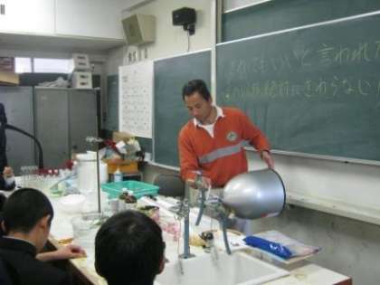 液体窒素(マイナス196度)を用いて、いろんなものが一瞬で気体から液体に、液体が固体に変わる様子を学習しました。TVなどで見かける「バラの花が一瞬で粉々になる」現象も目の前で確かめました。その他、酸素が液体になる様子(液体酸素は薄い青色でした!)やテニスボールなどさまざまな物質の変化を体験しました。