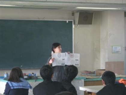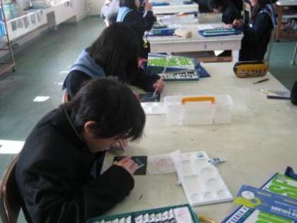 漢字一文字にイラストや図形を加えたオリジナルデザイン(生徒各自が考えました)をカッターナイフを使って薄いプラスティック板に刻み、絵の具で彩色していきます。自分の名前の一字をつかったり、「笑」や「絆」など好きな字をつかう生徒もあり、まさに十人十色。