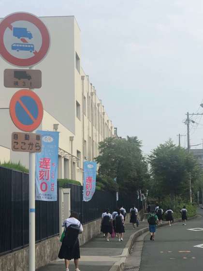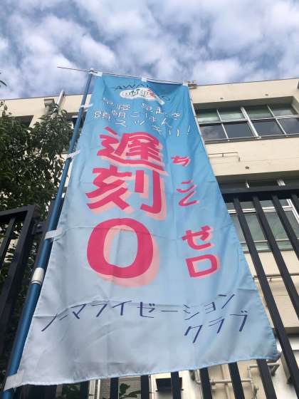 のぼりを掲げて遅刻無しを意識した取り組みです。