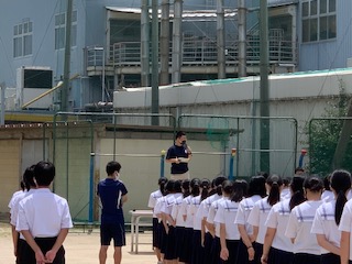 生徒指導主事の西野先生から今回の訓練が火災を想定していたので、火災の際に煙から身を守る方法としてハンカチの利用法にについてお話がありました。