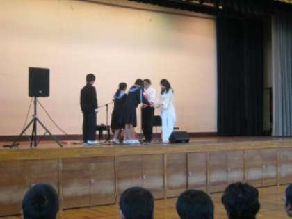 お話と演奏に聞き入りました 生徒会から花束をお贈りしました