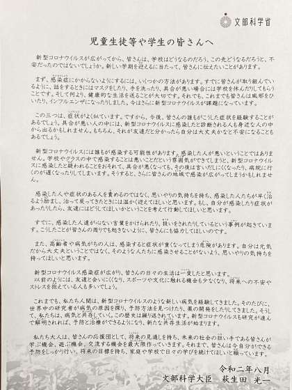 昨日、大阪市教育委員会を通じて、文部科学大臣からメッセージが届きました。