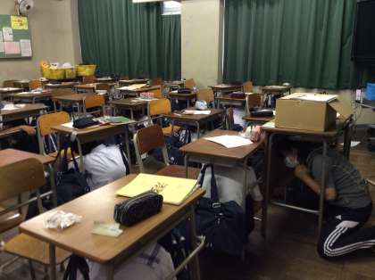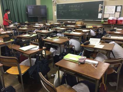 9時33分に大阪府が大阪府全域に緊急速報メールが発信され、続いて9時35分に大阪市が大阪市全域にメール発信が行われます。とほぼ同時に地域設置の屋外スピーカーから訓練放送が行われ、それに合わせて本校でも教頭先生から校内放送にて訓練指示が出て避難訓練を開始します。教室で授業中の生徒は、教頭先生の「校内の皆さんは、大きな揺れに備え、まずは身を守る行動をとってください」のアナウンス指示で、机の下に頭を入れることやかばんなどで頭を守る行動を訓練しました。また、体育館で授業中の生徒は、体育館外への避難とともに、ガラスや転倒危険個所から離れ、姿勢を低くし頭や体を守る行動を訓練しました。