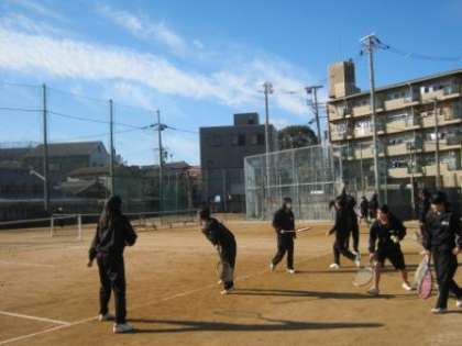 女子テニス部では、繰り返しサーブやボレーの練習に励んでいました。ボレー練習では、高さ3mほどの防球ネットをコート内に置き、ボールをふわっと上げる技を磨いていました。昨秋にコートの土を入れ替えたので、ボールのバウンドも良好な様子。手がかじかむ季節ですが、寒さに負けず頑張ってください!