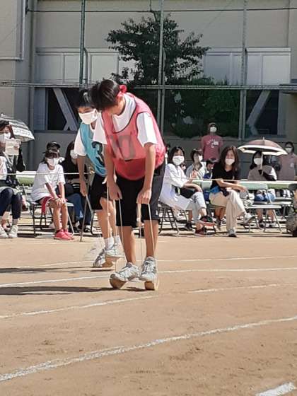 この「ぽっくりリレー」も従来の「ムカデ競争」の代わりに密を避け個人種目として行いました。