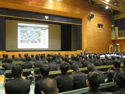 講師の的場先生は自身の歩んでこられたキャリアや経験をふまえて、人として生きるために大切なことをわかりやすくお話してくださいました。スピード感あふれる話術に生徒たちも引き込まれ、笑いあり涙あり、内容たっぷりの講演会でした。(「夢は逃げません。夢から逃げているのは自分です。」との先生のことばに、身のしまる思いがしました。)