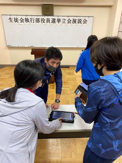 今年は昨年度とは違い、新型コロナウィルス禍の影響で、体育館に全校生徒を前に選挙演説・応援演説は出来ず、立候補者が会議室からオンラインでライブ演説を配信して、全校生徒が視聴し投票します。