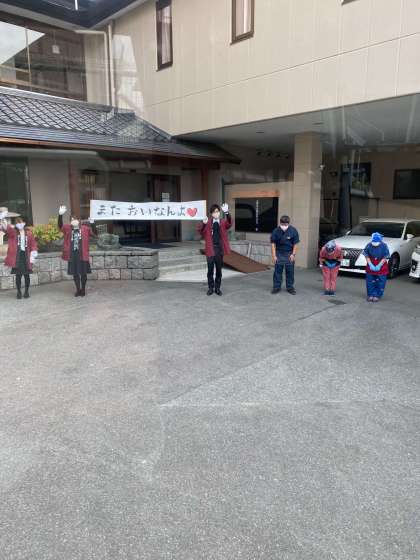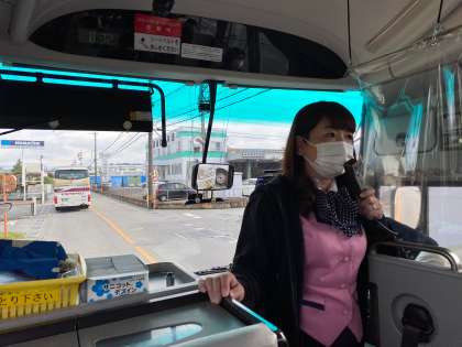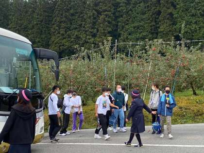 ホテルを後に、車中ではバスガイドさんが、これから向かう選択体験の蕎麦打ち、りんご狩・アップルジャム作り、バームクーヘン作りの説明をしてくれました。