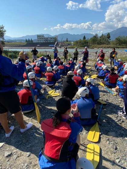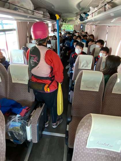 インストラクターさんがバスに乗り込み、ラフティングの注意事項の説明です。命に関わる大切なお話です。みんな真剣に聴き入っていました。