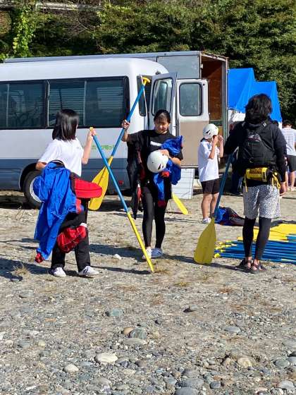 その後、男子はテント女子はバス車中で着替え、装備を持って河原に集合です。