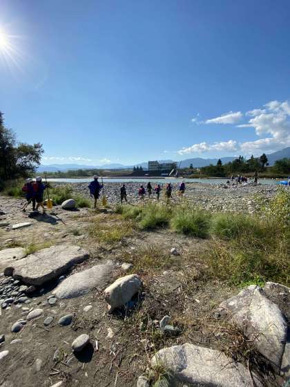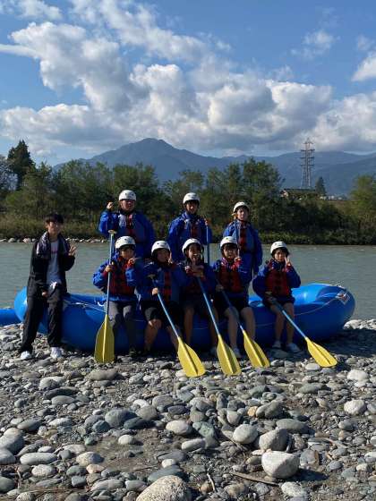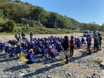 河原に集合後、装備チェックと再度全体注意があり、いよいよボートとご対面、生死を共にする仲間と記念写真?川を目の当たりにみな引きつった笑顔でハイポーズ。