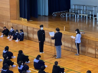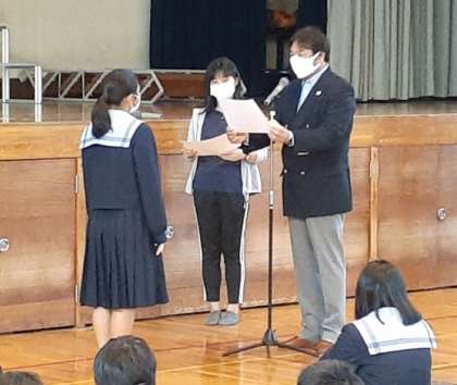 風紀検査に先立ち、月曜日の生徒会役員の認証式を受けて、令和2年度前期生徒会執行委員へ、学校長より感謝状の授与がありました。