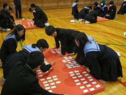 各クラスともに国語の授業をはじめ昼休みや放課後などの時間を使って百人一首を覚えたり、練習試合(!?)に励んでいました。本番ではグループに分かれて競技が行われました。