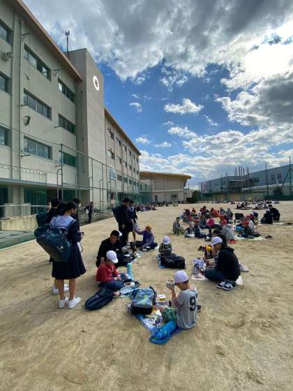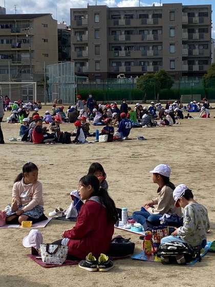 各アトラクションで楽しんだ後は、運動場で遠足さながら、班毎にビニールシートを敷いて、班長の『いただきます』を合図にお弁当を食べました。