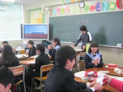 <上から> 事前説明のようす(中学生が進行役です)・国語(漢字を使ったしりとりや熟語の学習)・数学(トランプを使って正負の数の学習)