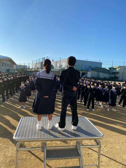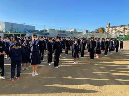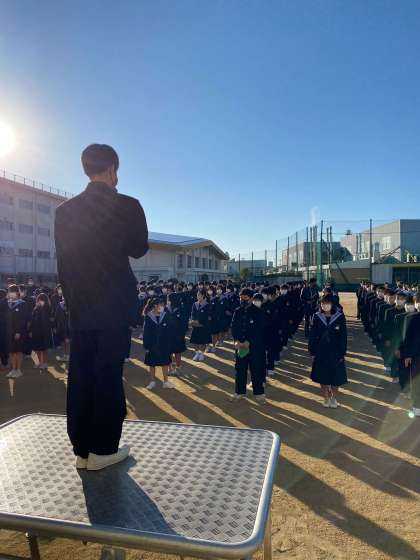 開始5分前には整列が終わり、準備万端です。朝のあいさつの後、生徒会長から今週の木・金にある2学期末テストを全力で乗り切ろうと話がありました。